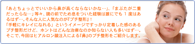 鼻のプチ整形(隆鼻術といいます)では「ヒアルロン酸」が多く使われています。